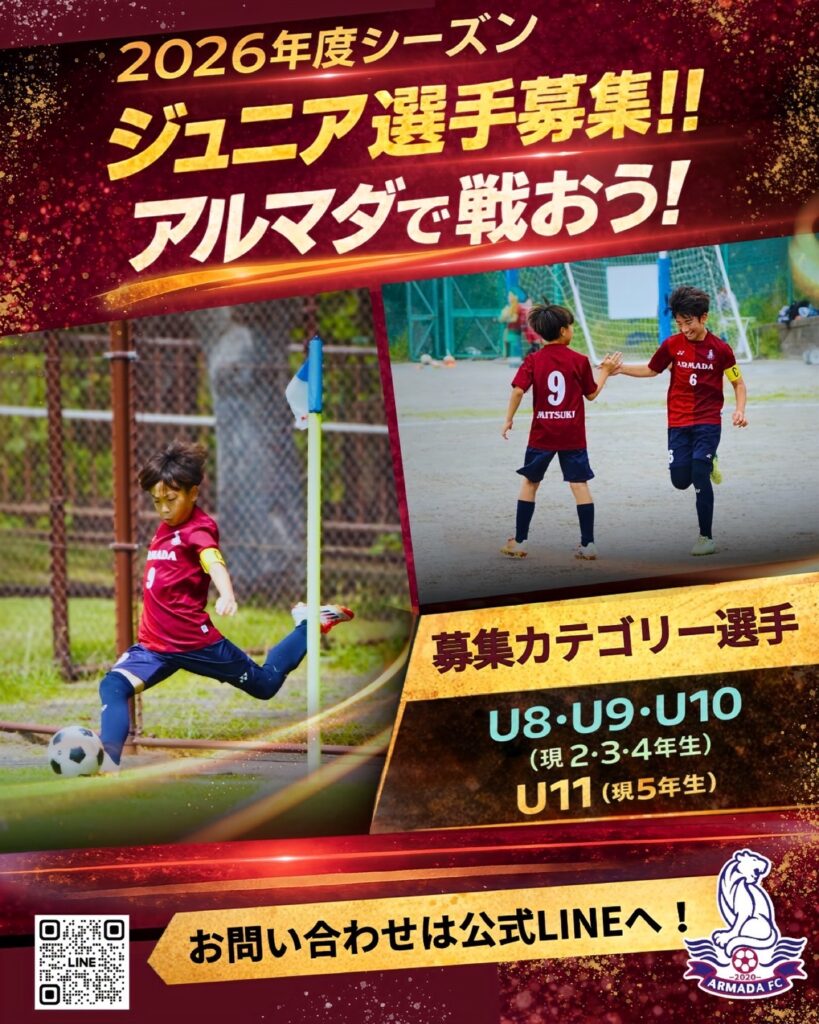 ARMADA FC は、2026年度シーズンに向けたジュニア選手を募集しています。 実際の練習に参加していただき、チームの雰囲気や指導内容を体感していただきます。サッカーの…