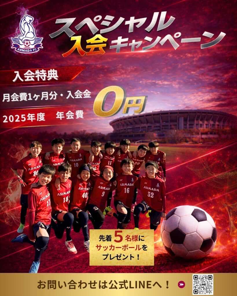 これからサッカーを始めたいお子様、さらに上達を目指したいお子様、体を動かして楽しみたいお子様まで、すべての方に合わせたサポートを提供します!3月31日までの期間限定で、先着5名様には追加特典をご用意!この機会にARMADAFCで一緒にサッカーを楽しみましょう!皆様のご入会を心よりお待ちしております。